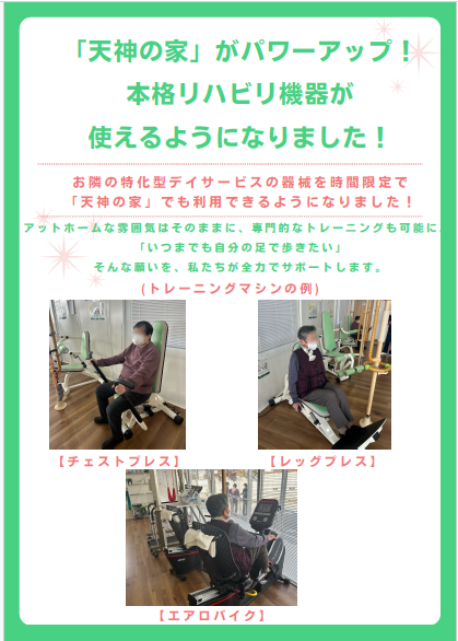 「天神の家」がパワーアップ! 本格リハビリ機器が使えるようになりました。