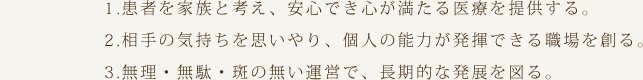 病院の存在の意味は、病める人は元よりそれに関わる人の生命を守り、人生を尊び健康で心豊かな社会生活を育むことにある。